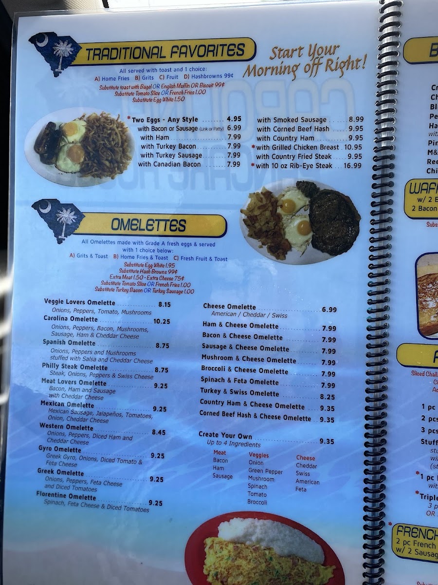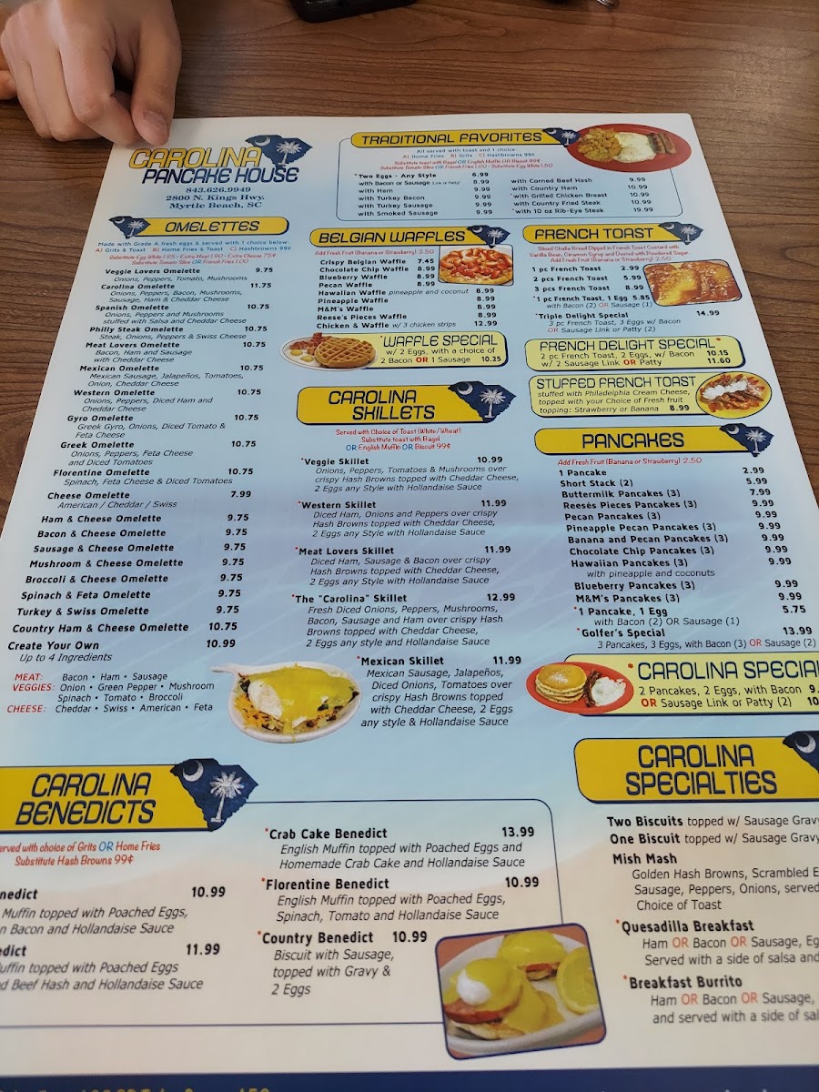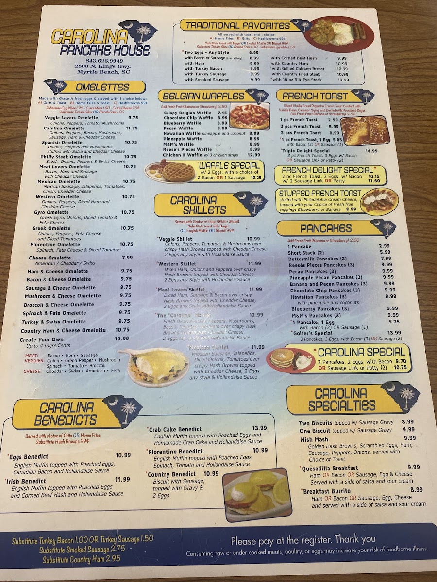 Welcome to Carolina Pancake House, your new favorite breakfast and brunch destination in Myrtle Beach! Nestled at 2800 N Kings Hwy, our menu is a delightful celebration of flavors designed to make your mornings special. We invite you to indulge in our signature dishes, like the mouthwatering Stuffed French Toast with Strawberries and our fluffy Pecan Pancakes, perfect alongside a cup of our Fresh Brewed Coffee. For the savory lovers, don't miss our Gyro Omelette or the hearty Chicken & Waffles that will leave you craving more. Whether you’re stopping by for a Two Egg Breakfast Platter or one of our satisfying Skillet Meals, you're in for a delicious treat. Sip on some Sweet Tea as you savor every bite, and be sure to explore our variety of offerings, including the Country Ham & Cheese Omelette and the classic Biscuits and Gravy. Come on over to the Carolina Pancake House and let us serve you a memorable meal that will have you returning time and again!